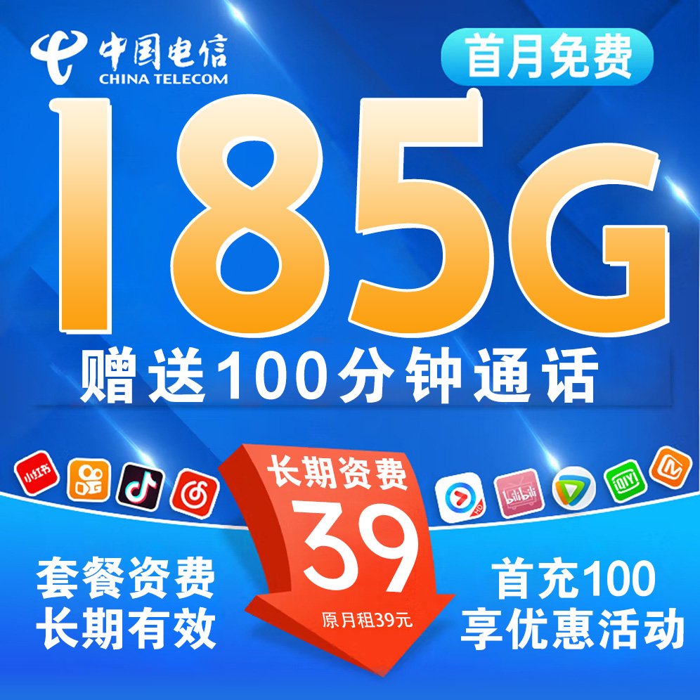 【仅发湖南省】湖南电信卡39元月享185G流量+100分钟通话【长期套餐】