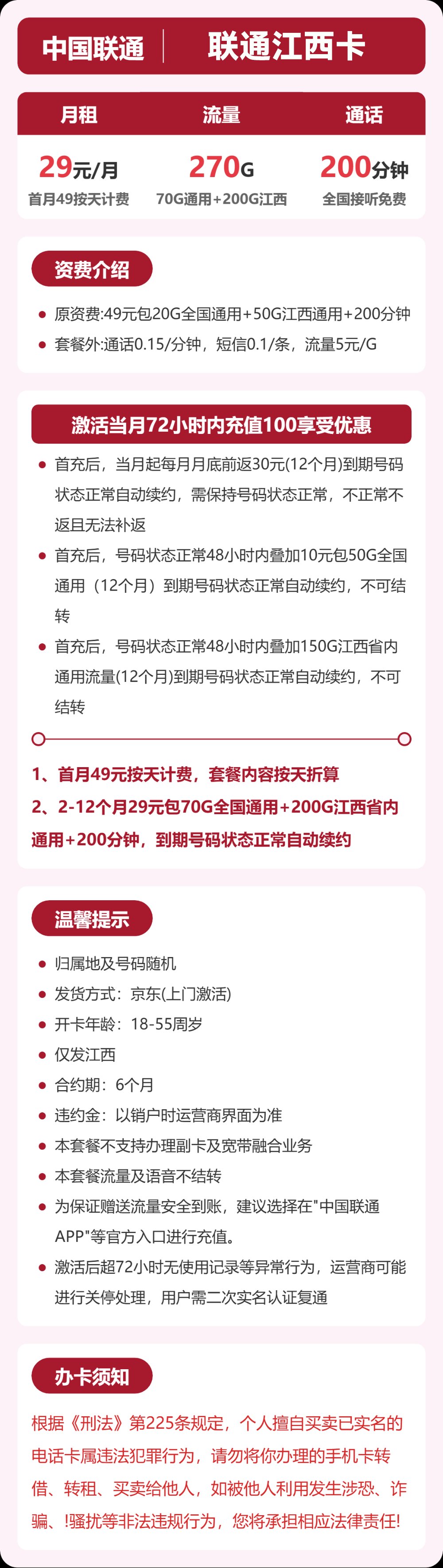 联通江西卡29元月享270G+200分钟【到期可续 长期套餐】【免费领取】【仅发江西】