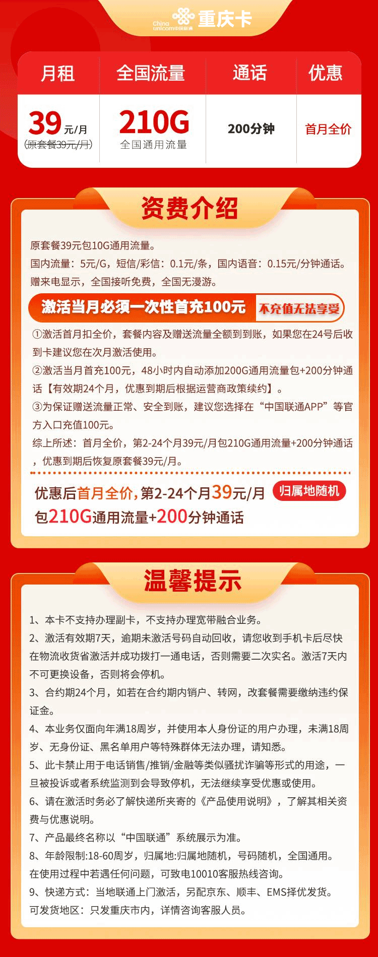 联通重庆卡39元月享210GB通用流量+200分钟【只发重庆市】