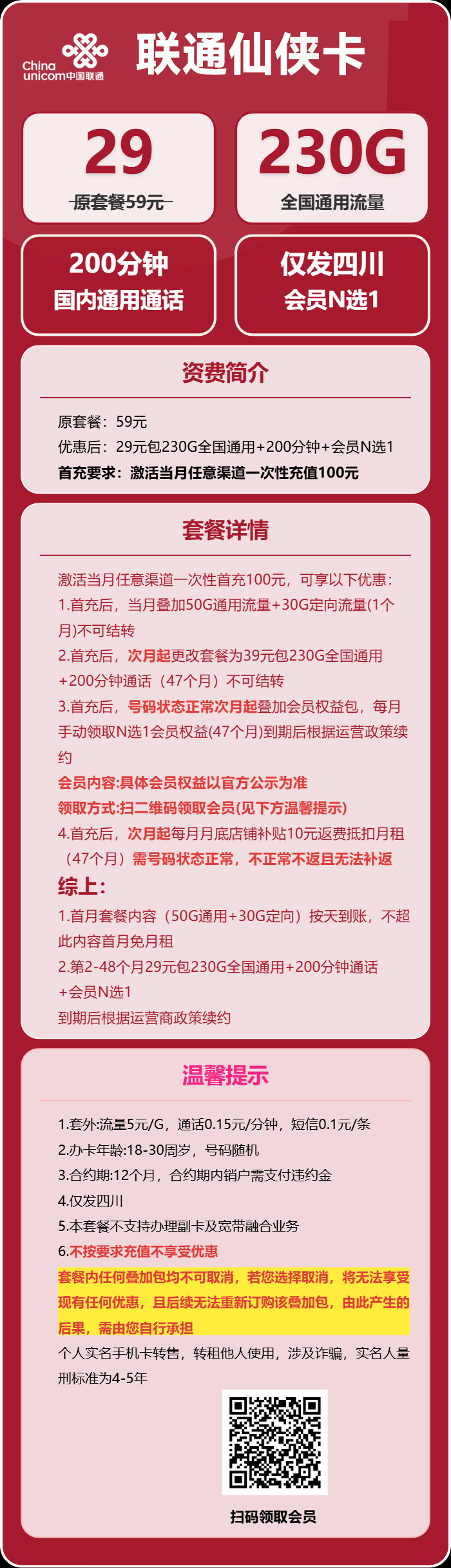 【下单立即联系客服审核订单】联通仙侠卡29元月享230G+200分钟+会员【18到30岁均可办理】【仅发四川】