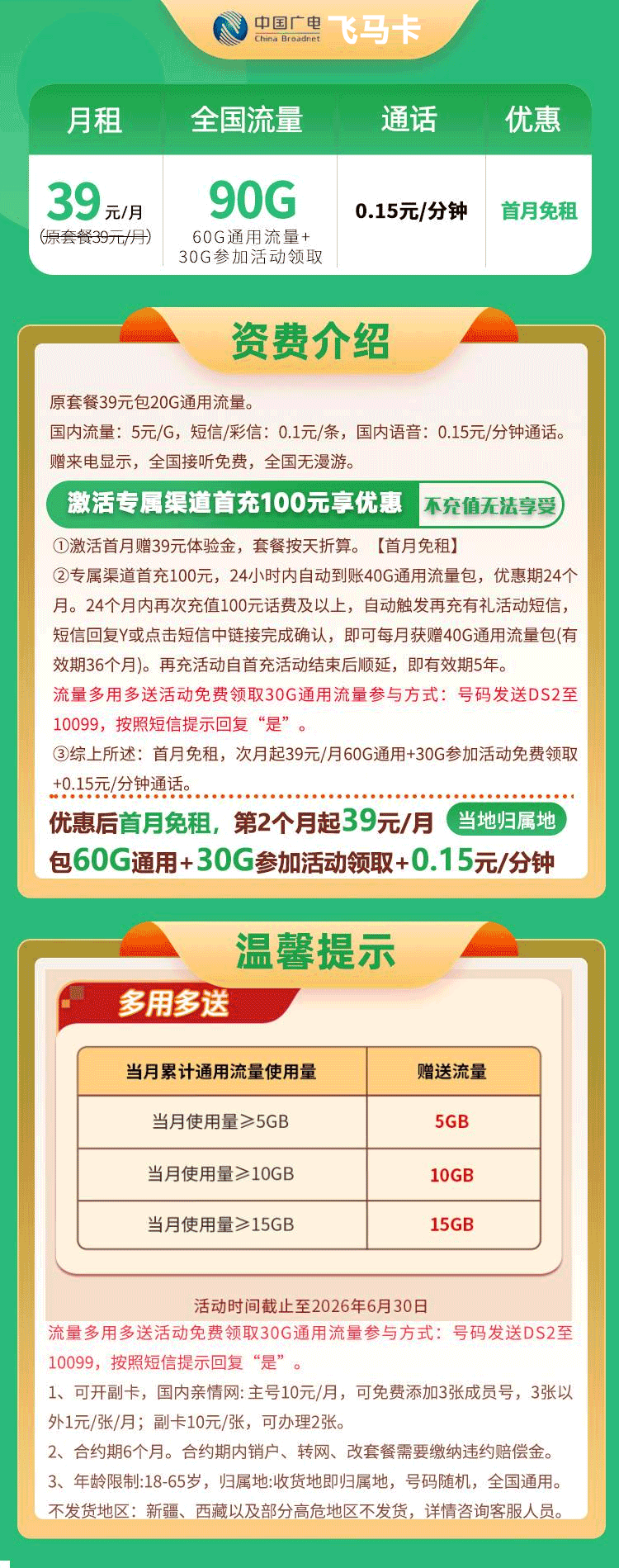 中国广电飞马卡39元月享90G通用+0.15元/分钟【归属地即收货地】