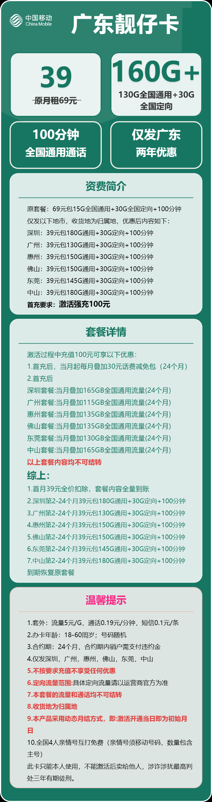 移动靓仔卡39元月享130G通用+30G定向+100分钟
