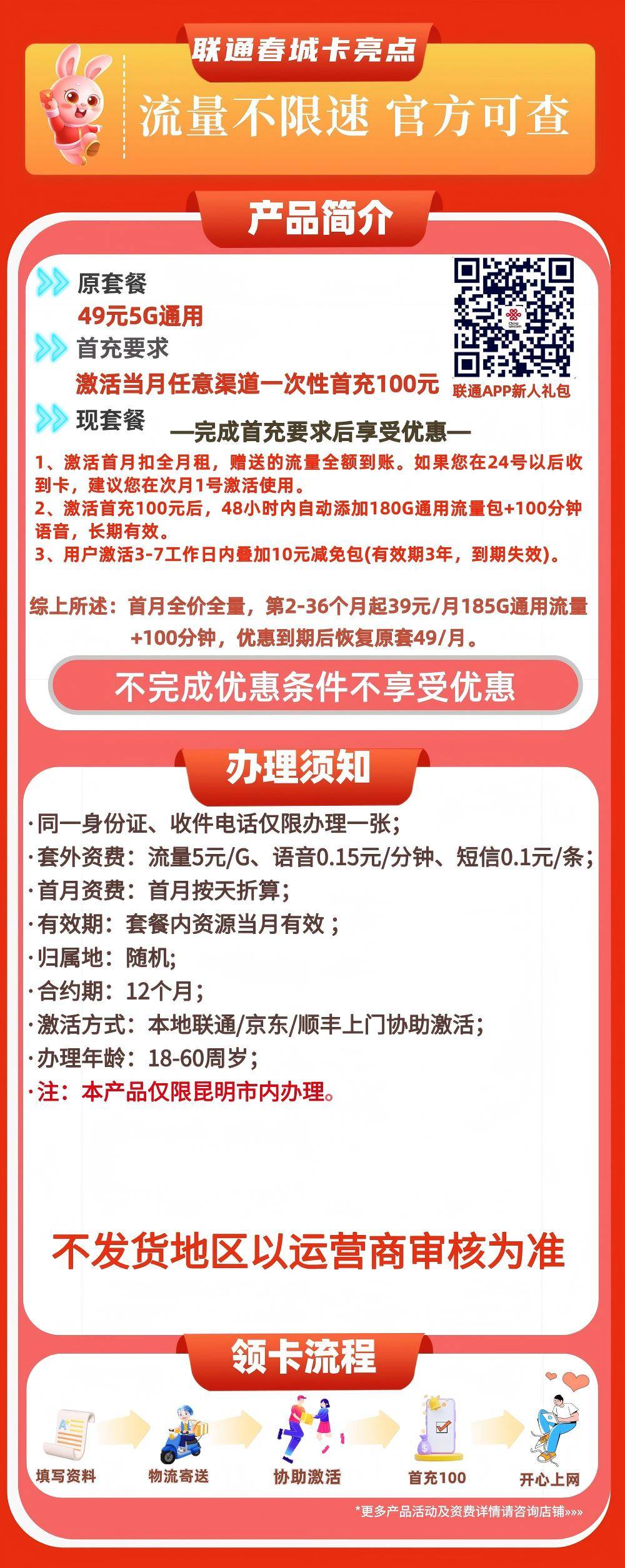 联通春城卡39元月享185G通用+100分钟【只发昆明】