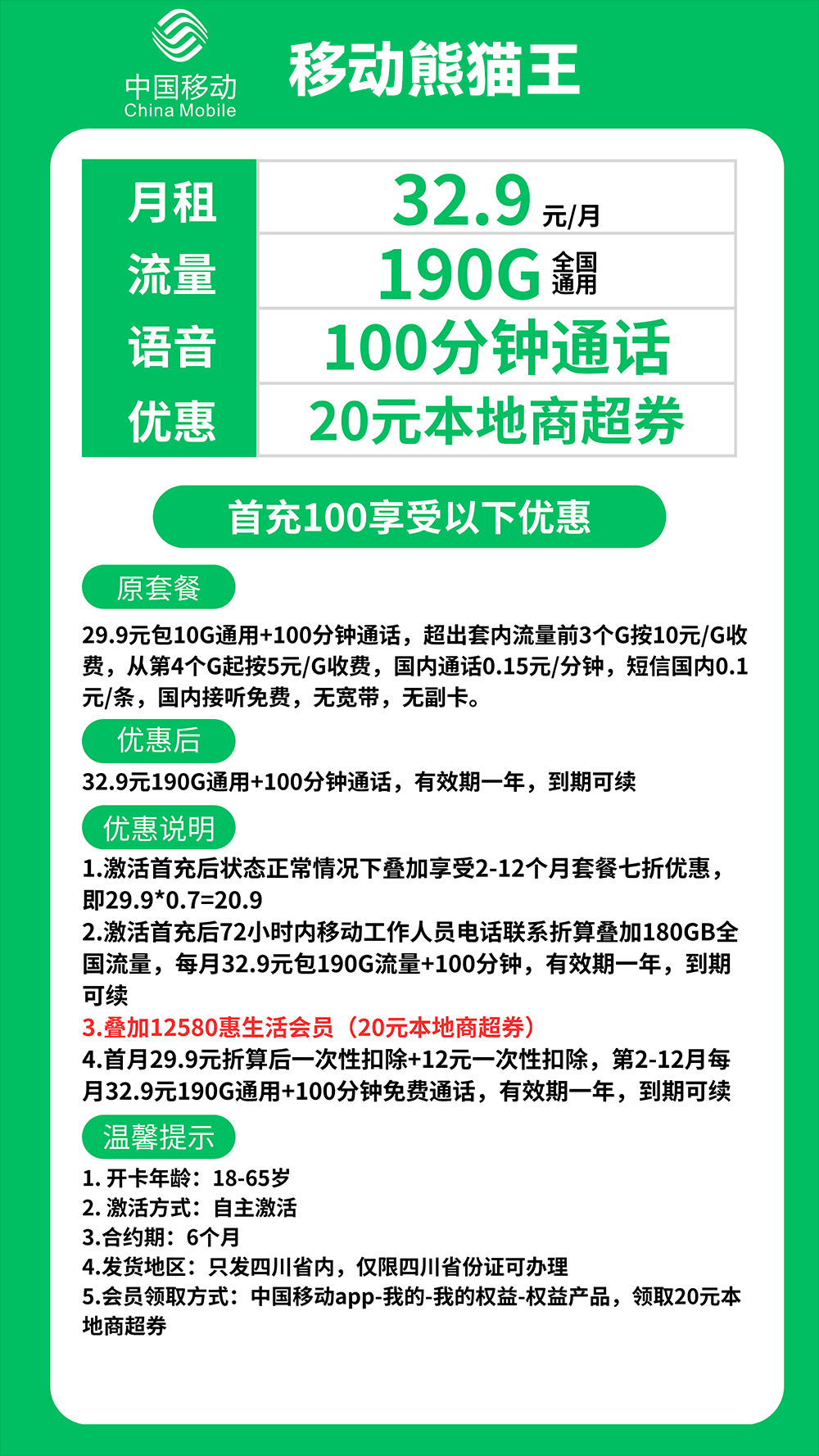 (18-65岁)只发四川移动熊猫王卡32.9元月享190G通用+100分钟【仅发四川】【0元预约 收费办理】
