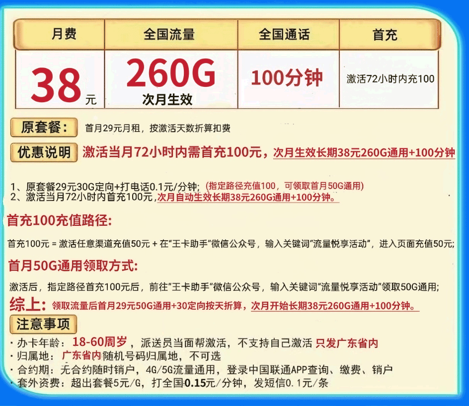 【仅发广东】广东联通卡39元月享260G流量+100分钟通话【长期套餐】【看详情参与首充】