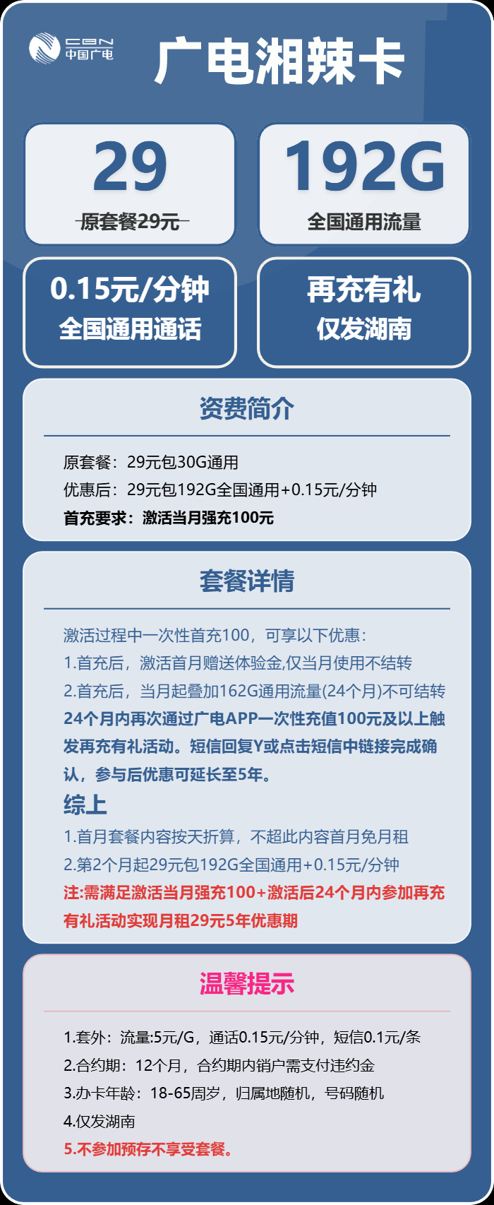 【仅发湖南】广电湘辣卡29元月享192G通用+通话0.15元/分钟