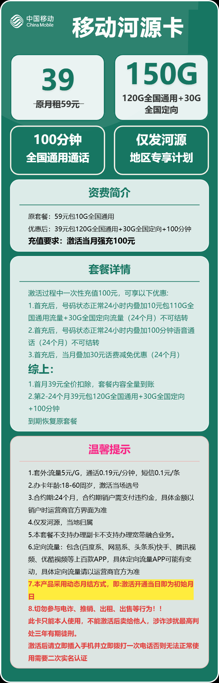 移动河源卡39元月享150G+100分钟通话【仅发广东河源】