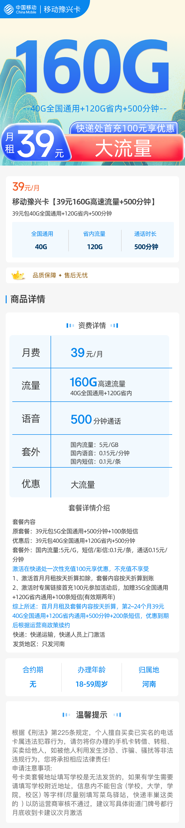 (18-59岁)只发河南两年移动豫兴卡 39元160G+500分钟+200短信